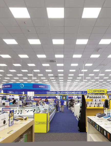LED panel pro zapuštěnou, stropní nebo závěsnou instalaci určené k osvětlení prostorů vyžadujících dokonale homogenní rozptýlené světlo. Je vhodné pro modulární podhledy s odkrytou konstrukcí (montáž do podhledu), kde je nutná vyšší regulace oslnění. Modely s mikroprismatickým krytem poskytují ideální osvětlení splňující normy pro vizuální komfort (UGR ≤ 19).